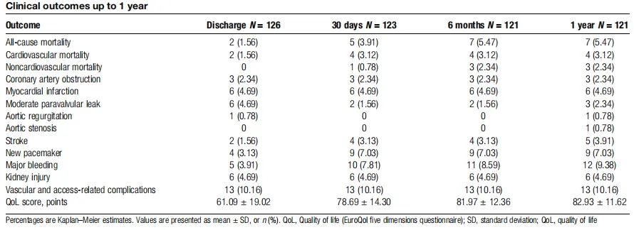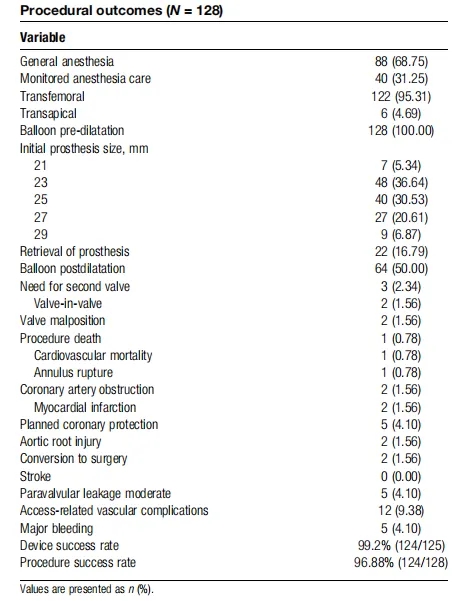 器械成功率达99.20%(124/125),手术成功率96.88%(124/128),充分体现了该系统在临床操作中的高可行性。围手术期无卒中发生,心血管死亡率仅0.78%,心肌梗死、冠状动脉阻塞、主动脉根部损伤发生率均为1.56%,无术中瓣环破裂相关严重并发症,相较于国际同类研究,围手术期不良事件发生率处于较低水平。