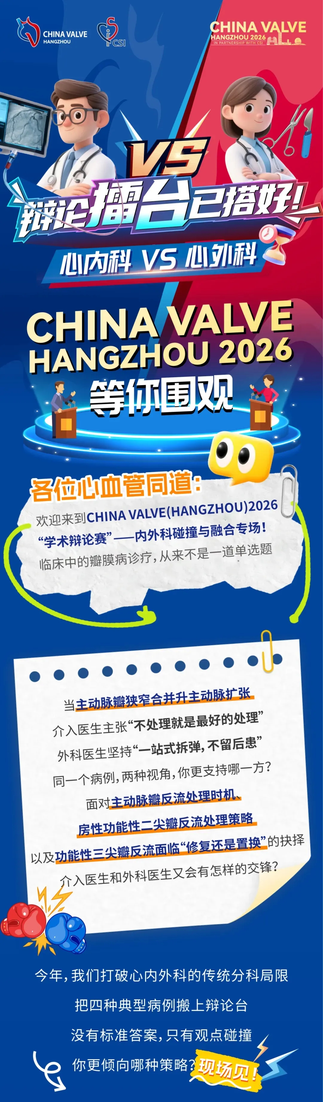 顶尖交锋!心内 vs 心外论道,你站哪方? | CHINA VALVE (HANGZHOU) 2026 内外科碰撞与融合论坛 2026-04-06 21:40:00 浏览量:2175 · END · 专业的心血管医生学术交流平台 医谱APP 点击下载 医谱学术 点击关注 版权及免责声明: 本网站所发表内容知识产权归属医谱平台、主办方以及原作者等相关权利人,未经许可,禁止进行复制、传播、展示、镜像、转载、摘编等。经授权使用,须注明来源,否则将追究其法律责任。有关作品内容、版权和其他问题请与本网联系
