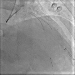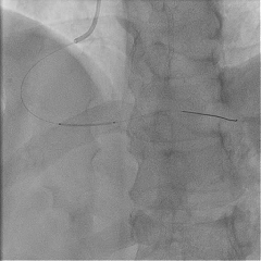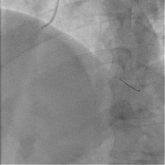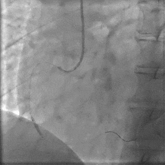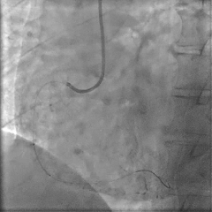 冠脉造影提示:左前降支近中段最重狭窄程度95%,钝缘支a最重狭窄80%,后侧支最重狭窄90%。于左前降支行介入治疗。