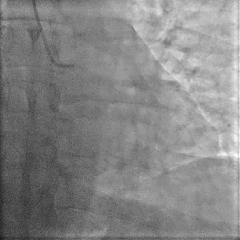 冠脉造影提示:左主干未见狭窄;左前降支近段局限性狭窄50%,中段最重狭窄40%,TIMI血流3级;回旋支无狭窄;右冠状动脉近中段可见弥漫性中度钙化,TIMI血流3级,最重狭窄70%;右冠状动脉远段TIMI血流0级,最重狭窄100%。