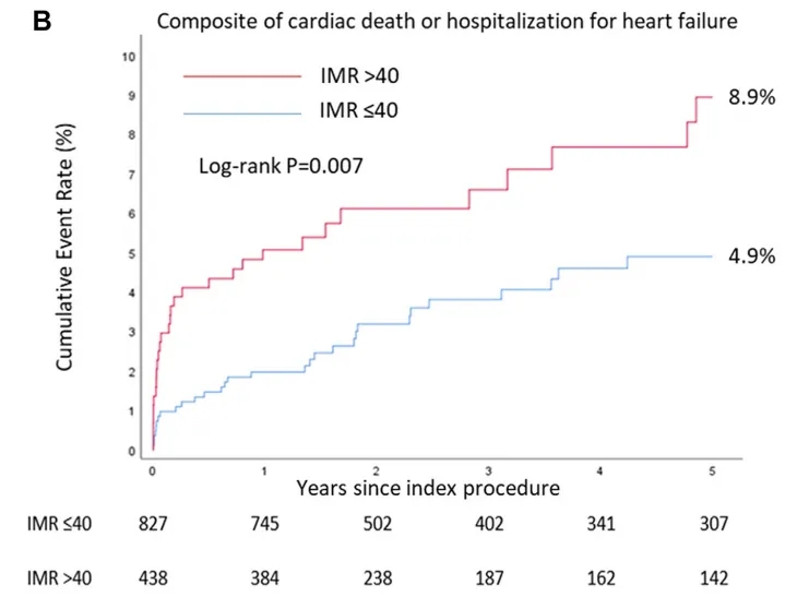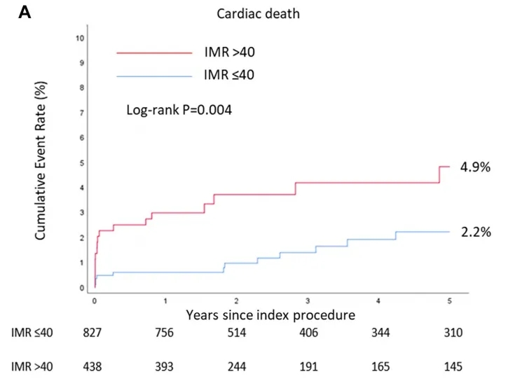 现有临床证据表明,ACS患者合并CMD会增加其远期不良事件风险。对该类患者行急诊PCI,术后即刻进行IMR等的检测,意义重大:1.可精准评估微循环功能。IMR是当前微循环评估指南I类推荐的“金标准”[4],可精准评估术后微血管是否通畅,确保心肌再灌注。2.预测再住院率,远期不良事件风险及心功能恢复情况。研究显示,PCI术后复发心绞痛的患者中,异常IMR的患者比例更高[5]。此外有研究指出,STEMI病人开通罪犯血管后,IMR≤40的患者预后显著优于IMR>40的患者[6-8]。存在CMD的STEMI患者预后更差,缺血后CMD预测的长期不良事件风险(全因死亡、新发心衰、心脏骤停等)增加超过4倍,主要归因于心衰明显增加[9]。3.指导个体化治疗策略。对于CMD患者,可针对性予β受体阻滞剂、他汀类药物等一线用药[2]进行治疗,以改善患者预后。4.术后随访评估治疗效果。在术后随访过程中,测定IMR等关键指标可动态监测患者微循环功能变化情况,评估治疗措施的有效性。