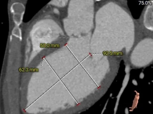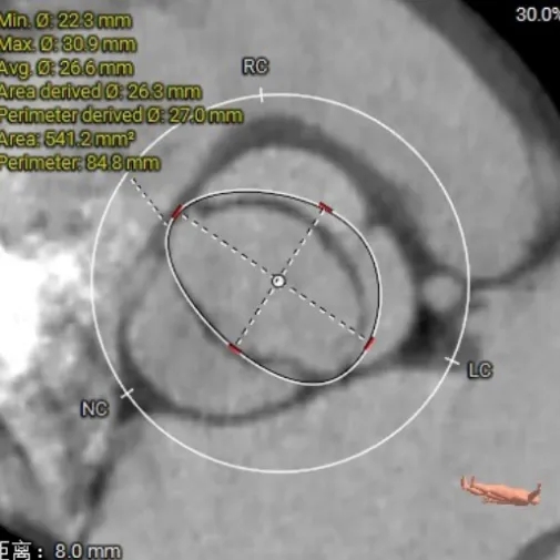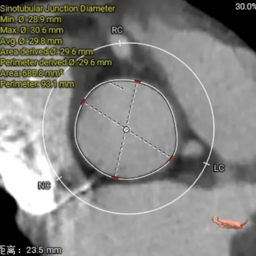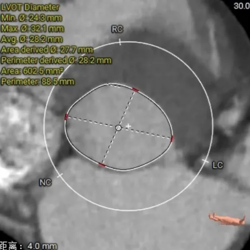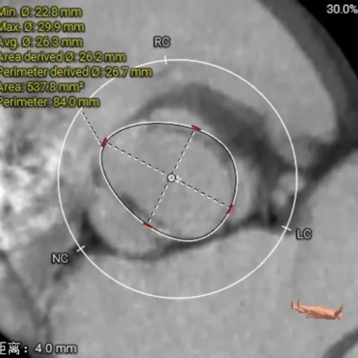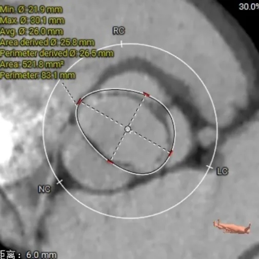 2. 瓣膜选型:经团队讨论,最终选择TAVTF29型号瓣膜,虽然主动脉瓣环和左室流出道oversize率分别为4.32%和2.84%,但通过直筒瓣架全瓣架参与锚定的特点,依然可以稳定释放。